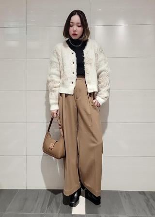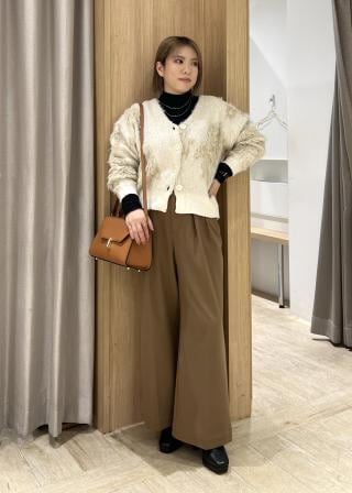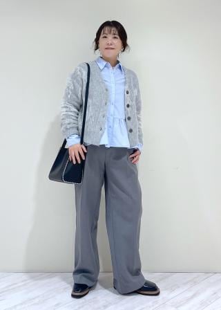 釦を全部閉めて、プルオーバーとしての着方がおすすめ。比較的ボトムを選ばないカーディガンシルエットなので、衿ぐりを後ろに抜いて、ショートパンツやミニ丈スカート、ワイドパンツやストレートパンツ合わせがおすすめです!