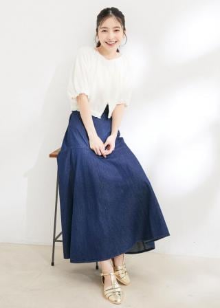 1枚着のトップスとして、ハイウエストボトムと合わせるとバランス◎