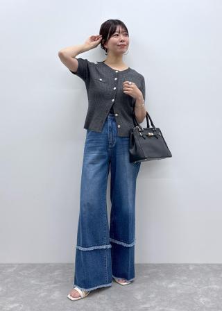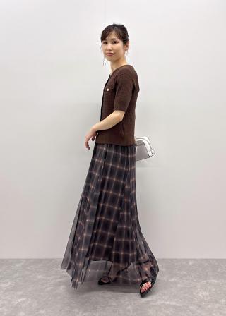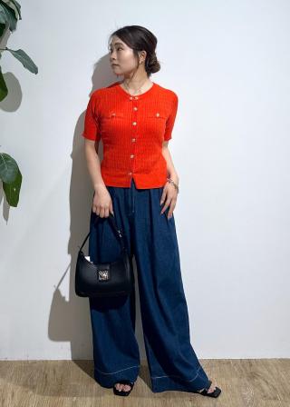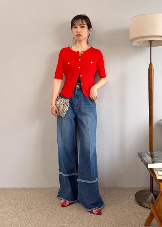休日は、フレアスカートやデニムと合わせてフェミニンカジュアルに仕上げるのもおすすめです。華やかに決まる主役級ニットは、1枚あると着回し力抜群。冷房対策や、ちょっとした羽織り代わりや重ね着としても活躍します。晩夏から秋口にかけてもおすすめ。