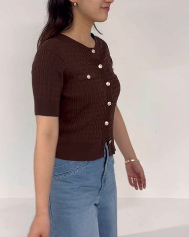 上品な印象を与える金ボタンが並ぶ、半袖ニットカーディガン。