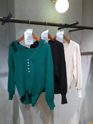 ・カーディガンは少し後ろに抜けるデザインでフロントのパール釦が女性らしく華やかにしてくれます。
