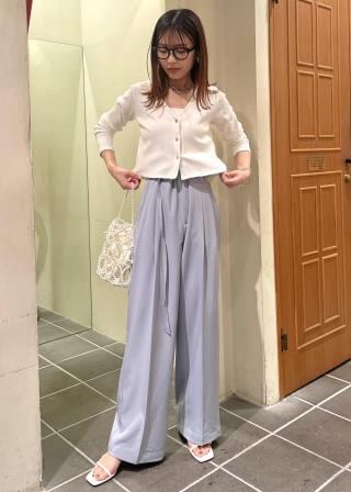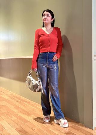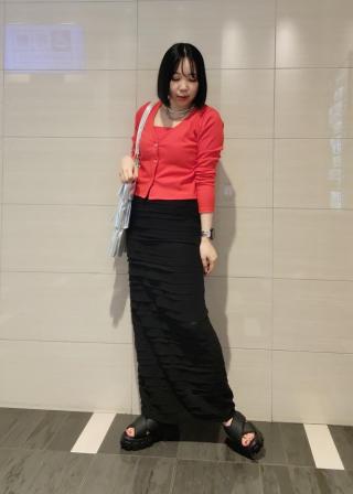 152cmでFサイズ着用し、着丈はウエスト位の短め丈。キャミソールとのセットアイテムです。身体のラインを拾いすぎない細身のシルエットとボタンの♡がポイントです。