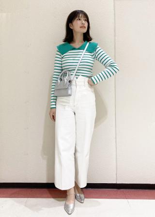 大きい衿とほどよく開いたデコルテ部分が上品で、さらに小顔に見せてくれる嬉しいトップス。