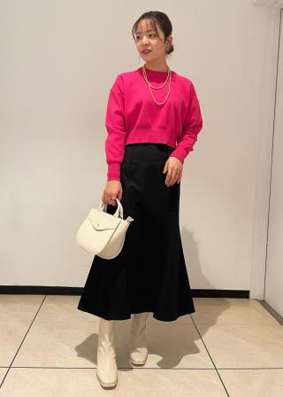 ボトムを選ばないデザインですが、ショート丈なのでボリューム感あるスカートやハイウエストボトム合わせが特におすすめです。