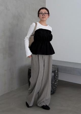 ニットにドッキングされたビスチェの胸元のシャーリングフリルデザインとギャザーペプラムが女らしい1着です。