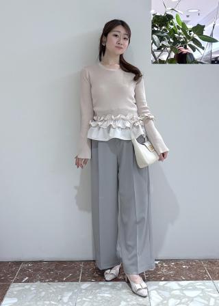 シャツ素材のフリルデザインが裾にドッキングされた1枚映えニット。ニット部分は体のラインに沿うように、でもぴたぴたすぎないシルエットに仕上げました。袖口が少し広がっている部分も女性らしくてかわいいポイントです。お腹周りをフリルが丁度よく隠してくれて、着丈も短めに設定しているのでスタイルアップに繋がります。