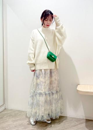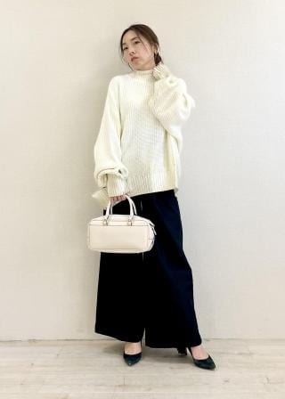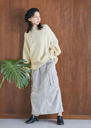 女性らしいシルエットに辛口なデザインのニットなので甘めのデザインのスカートでテイストMIXコーデがおすすめです。