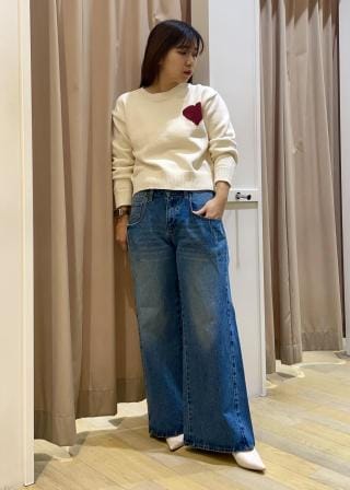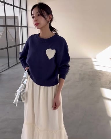 シンプルながらもハート柄のアクセントがキュートなニットです。
