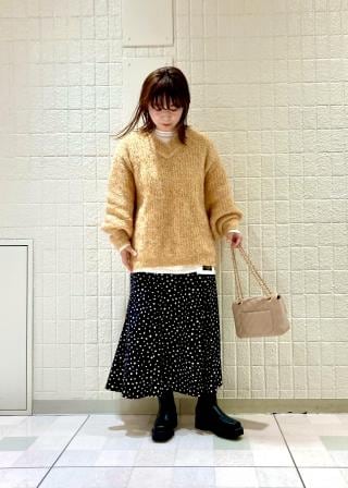 Vネックでデコルテラインが綺麗に見えますし、インナーを重ねてのレイヤードスタイルもおすすめです♪