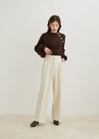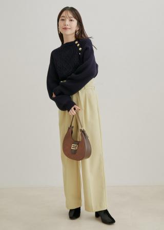 カジュアルな印象になりやすいケーブルニットにメタル釦を付ける事で、カジュアルにも綺麗目なスタイルにも合うニットに仕上げました。