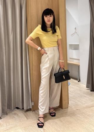 オフショルダーだけど、肩からずり落ちない肩マチ付きデザインで安心感もありながら、フェミニンなスタイリングが楽しめるデザイン。