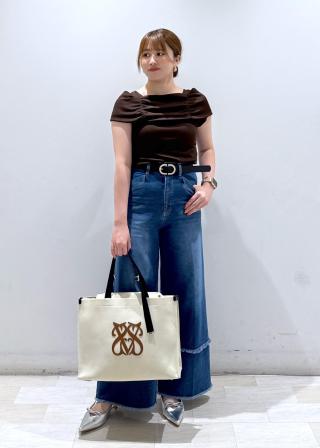 オフショルダー衿部分のシャーリングがかわいくて、今年らしい一着。