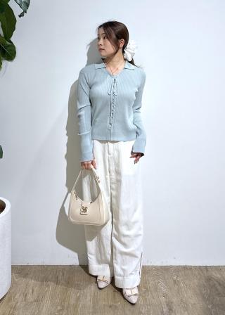 衿付きデザインなので甘さの中にクールな印象も。リブ編みですっきりシルエットです。