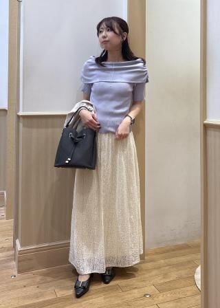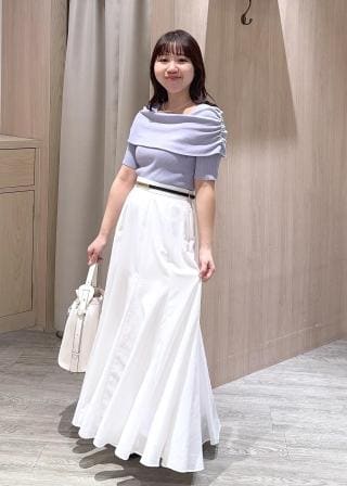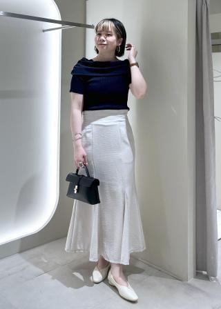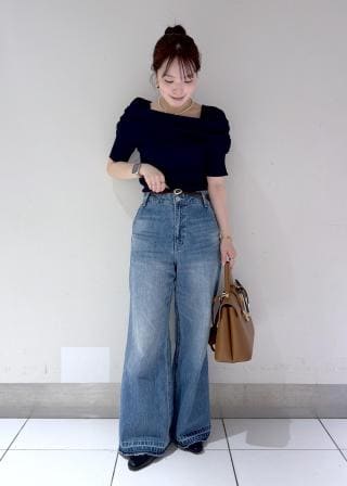 程良くフィット感のあるリブニットとフラットで大きなオフショルダー衿の編地のコントラストがとても高見えして大人っぽい一枚です。