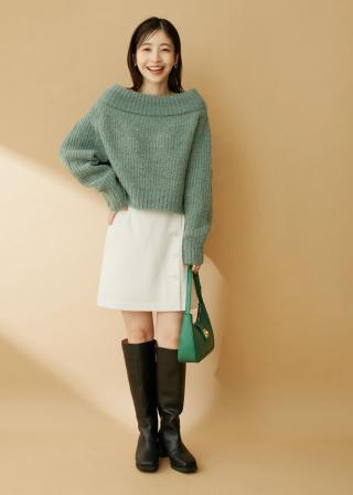ラメ糸を引き揃えたローゲージのオフショルニットです。