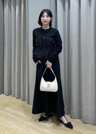 フォルム感とツヤ感のあるビスチェ素材で華やかさをプラスするビスチェコンビプルオーバー。