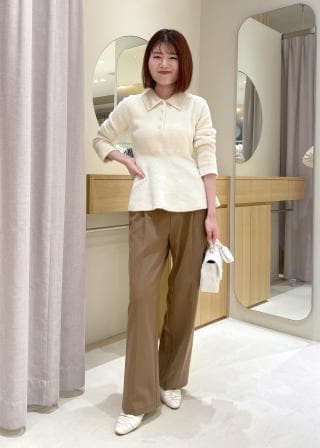 襟付きが今年らしいペプラムデザインのニットトップス。シャギーの糸を使い女性らしい雰囲気が出るようにこだわりました。