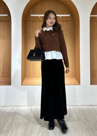 ニット部分はすっきり細めのケーブル編み。シャツをレイヤードしているようなドッキング仕立てです。