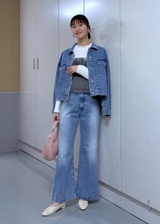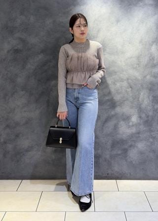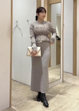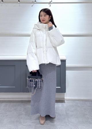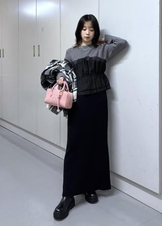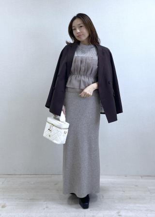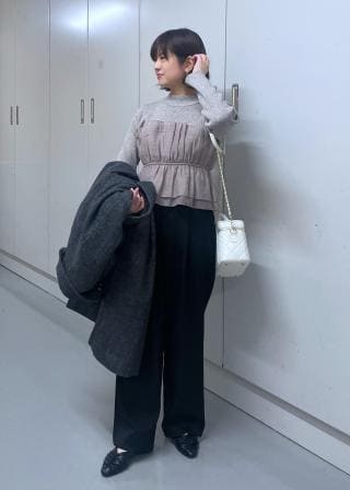 ボトムはパンツやピッタリとしたスカートがおすすめ。裾から出てるニットリブ部分はボトムにインすると決まりやすいです。