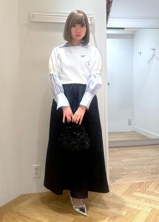 同展開のフレアースカートもおすすめです。デニムあわせやワイドパンツなどにもあわせやすいちょうどよいサイジングです。