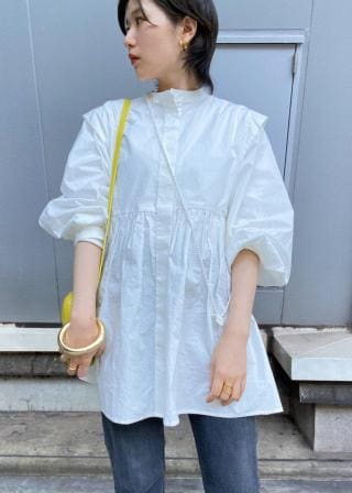 コットンの張りを活かしてふわっとしたウエストの切り替えとボリューム袖がポイントのチュニック。