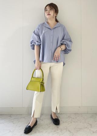窮屈すぎない丸首で、首元が詰まっているのが苦手な方にもおすすめなブラウスです。