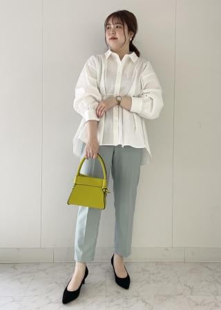 ただのノーマルなワイシャツだと固くなり過ぎるので、少し女性らしいデザインだったので、購入しました。胸の下くらいから少しフワッと広がっているので、パンツに合わせると足長効果もあり、まとまりもよくなります。カラーは水色を選び、夏前までは雨も多いので、少しでも爽やかな感じに着たいと思いました。ネイビーのスラックスに合わせたらとても綺麗にまとまりました。