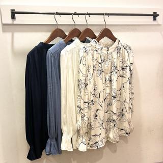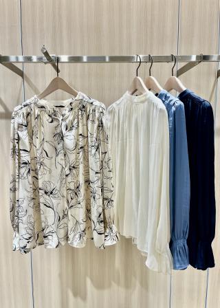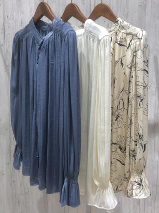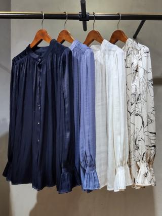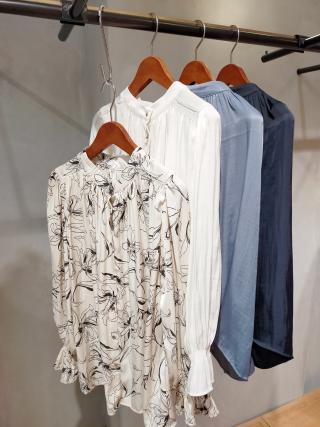 ・肩にシャーリングが入ったデザインでとろみ素材に動きを出しました。
