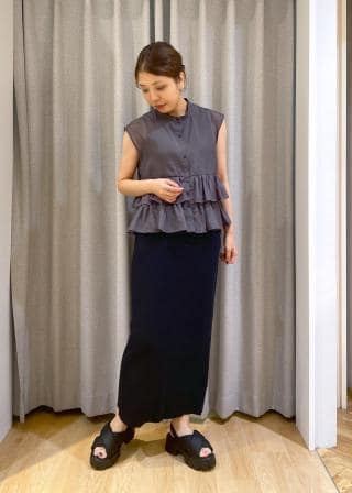 2段フリルとラメのような繊細な艶のあるシアー素材が今年らしいです。171cmで腰骨辺りの着丈なので、すっきり着用できます。