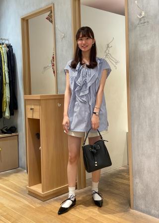 胸元の紐は垂らして、胸元のVライン見せやリボン結びでポイントを持ってきた着こなしもできます。