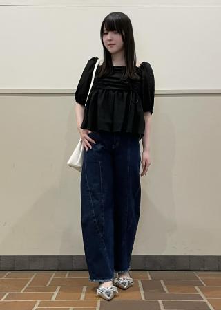 女性らしいデザインのブラウスなので、ボトムスはデニムなどカジュアルなアイテムとの合わせがおすすめです。