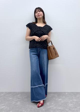 オフの日は、デニムやワイドパンツでカジュアルダウンしても◎。インでもアウトでも着映えするデザインのため、ウエストインでスタイルアップ見せ、アウトでリラックス感を演出など気分に合わせたアレンジが可能です。