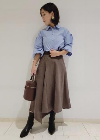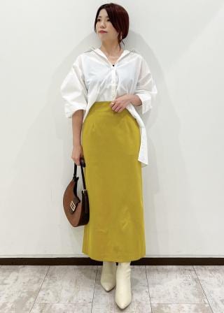 裾はインせずテーパードパンツやナローシルエットのスカートと合わせるスタイルがおすすめです。