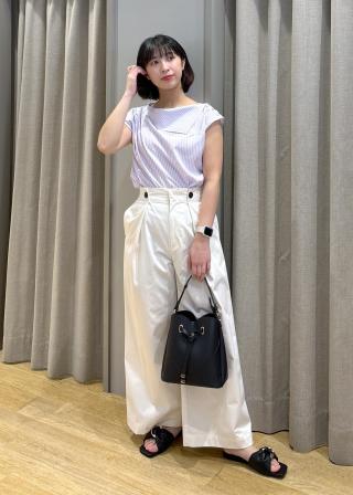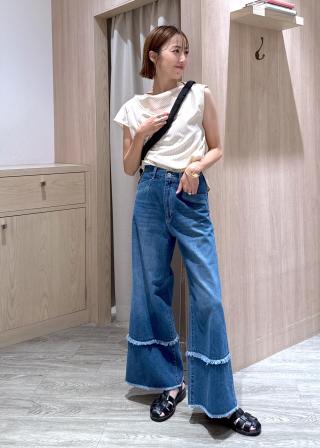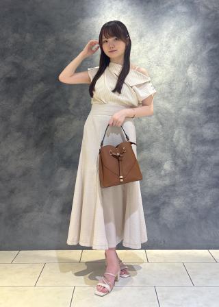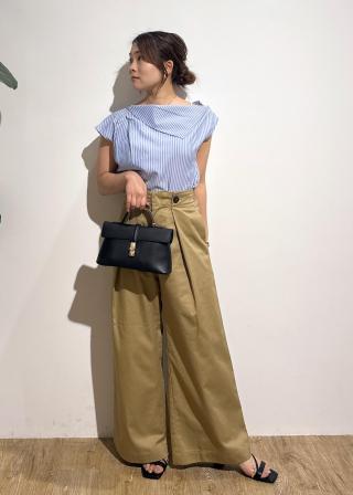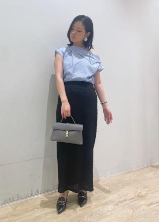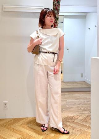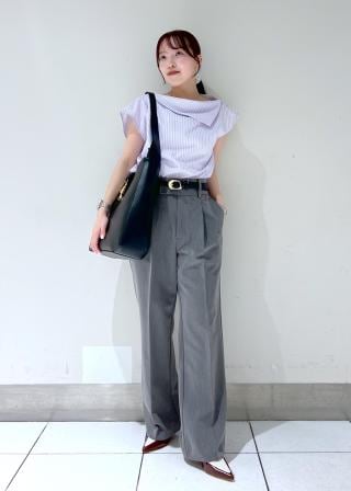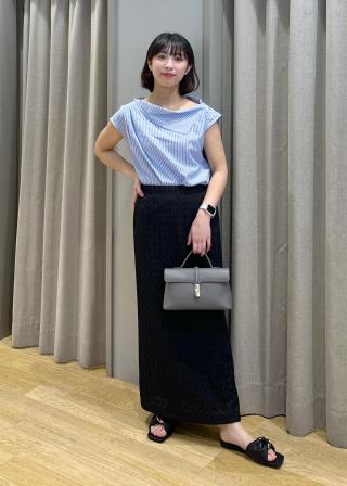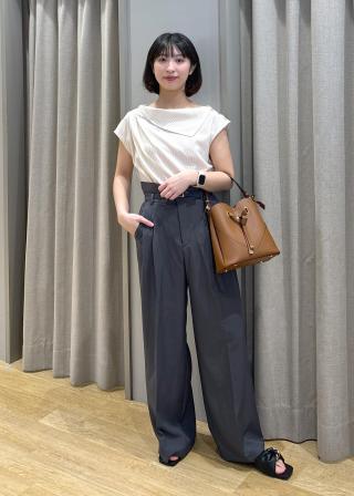 襟元から肩にかけてデザインがあるため、ウエストをインするスタイルもおすすめ。