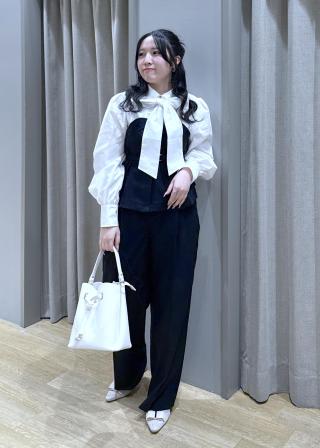 リボンボウタイと共布ベルトがついているので、シーンに合わせて違う見せ方が出来ます。着方としてはどちらか1つつけるのがおすすめです。