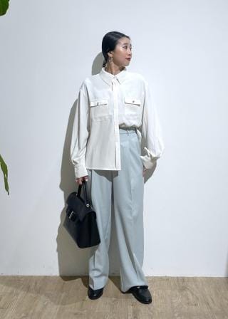 身長156cm/F着用。着丈はお尻隠れる長さで袖丈は手の甲が隠れる長さです。程よく厚みがあるジョーゼット素材のシャツはとろみ感がたっぷりで上品に着られます◎ハリのあるシャツが苦手な方におすすめ‼︎袖を捲るとぽわんとしたシルエットが女性らしさを出してくれます‼︎洗濯後アイロンなしですぐに着られますよ♪