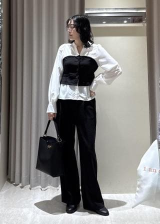 スキッパースタンドカラーシャツとビスチェがドッキングされた一枚で様になるブラウスです。