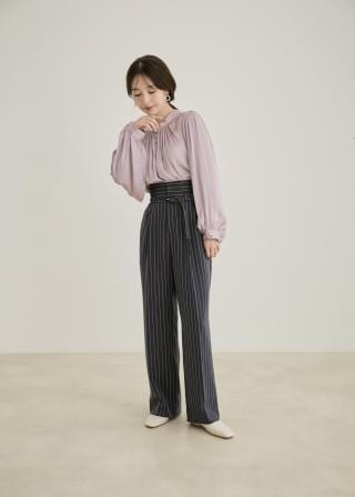 【洗える】【前後2WAY】サテンギャザースタンドブラウス
