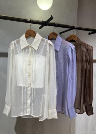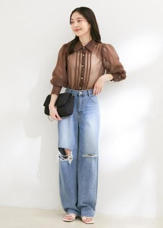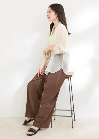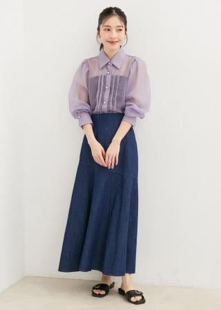 透け感のある素材で、程よいボリュームのあるスリーブとさりげないピンタックがポイントのブラウスです。