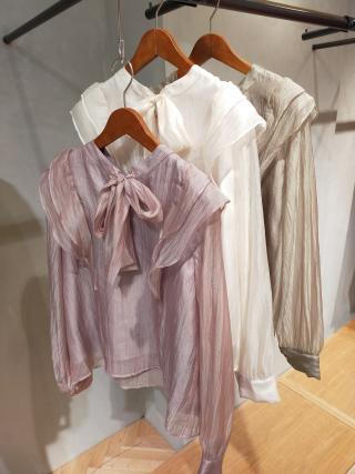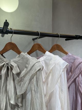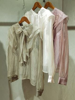 ショルダーの”ひらり”と揺れるラッフルとリボンタイが、とてもフェミニンなブラウスです。