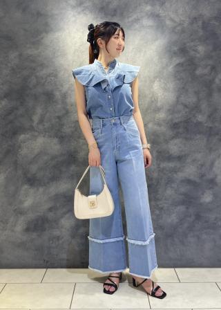 デニムで作るラッフルがコーディネートを一気に華やかに!夏に嬉しいノースリブラウス。