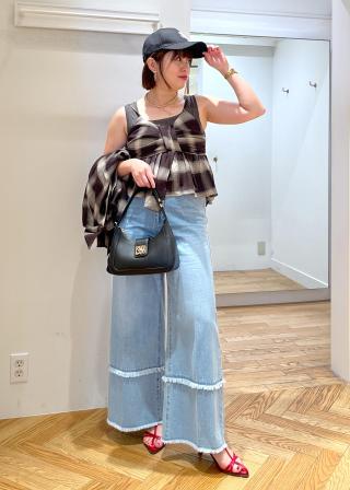 ボトムスはデニムはもちろんフレアスカートやIラインスカートなどがおすすめです!インナーは、セットのオンブレチェックビスチェ(品番:BVF45020)か、タンクトップがかわいいです。