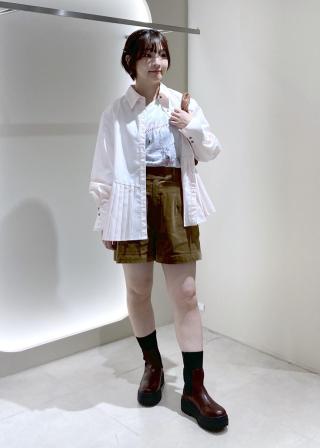 イレギュラー切替で裾はプリーツデザイン。ベーシックな襟付きシャツですが、裾ポイントを持たせることでスタイリングの幅が広がります。袖口の長めのカフスは折り返して着用することができます。羽織としても着用いただけるようなサイズ設定に。襟先の刺繍もアクセント。