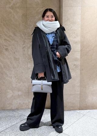 お尻にかかる着丈で、パンツスタイルでも安心感があります。
