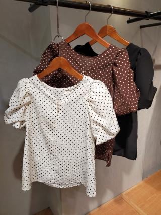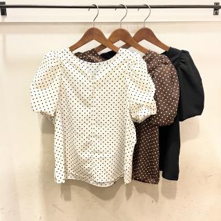 ドット柄とパール釦が女性らしさを演出してくれるブラウスです。