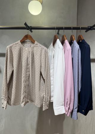 ON・OFF兼用で使える着やすい無地のオフホワイト・ネイビー・ピンクと、ジオメトリック柄2色、線花柄の全9色展開です。