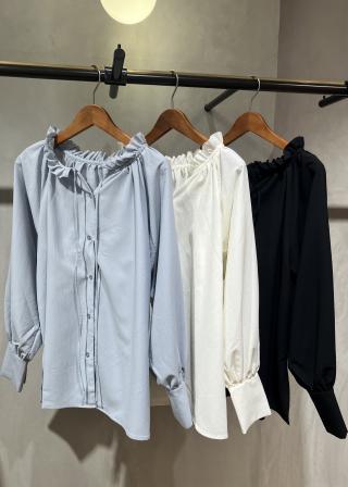 衿ぐりにフリルが施されてギャザーがたっぷり入ったブラウス。