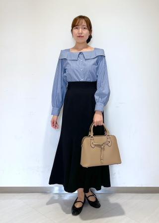 春夏にに大人気だったオフショル風のブラウスが長袖バージョンになって入荷⭐︎女性らしいデコルテラインに、キラッとしたボタンがまたお洒落で可愛いです!お袖は少しボリュームがありますが、フワッとしすぎないので骨ストの私でも上半身が大きく見えることはありませんでした。ホワイト系(11)とブルー系(45)のカラーではストライプ柄になるので、着た時に縦が強調してスッキリとして見えるのが嬉しいです。着るだけでそれどこで買ったの?と聞かれるのでオススメの一枚です!