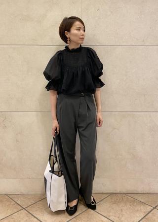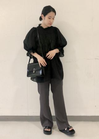シアー素材のブラウスは、襟や袖のフリルも透け感があるので可愛さプラス透明感を与えてくれます。