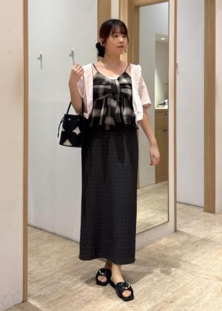 152cmでFサイズ着用し、着丈は腰にかかるくらいのコンパクト丈。綿とレーヨンでサラッと肌触りのいい素材感は夏にもぴったり!すっきり見えのサイズ感なので、小柄さんにもお勧め!chocomooとのコラボアイテムです♪
